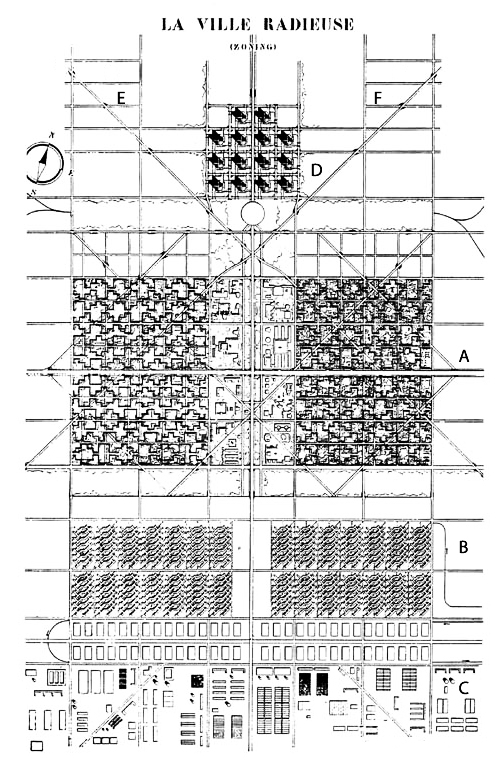 Mặt bằng minh họa ý tưởng Thành phố Tươi sáng của Le Corbusier. Chú thích: A: Dân cư/Văn hóa; B: Công nghiệp nhẹ; C: Công nghiệp nặng; D: Thương mại; E/F: Nhà nước/Giáo dục