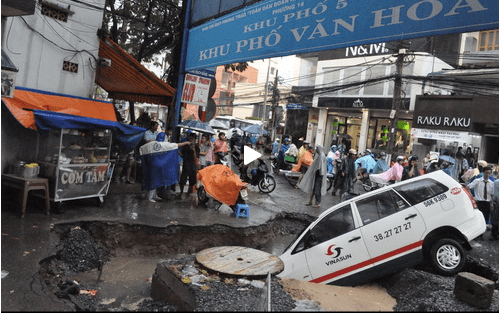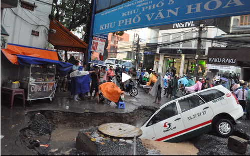 Taxi sup hố đào đường thể hiện sự vô trách nhiệm của cơ quan công quyền. Làm sao người dân có thể thực hiện văn hóa giao thông trong một môi trường không có văn hóa? Ảnh chụp từ trang TuoiTre Online
