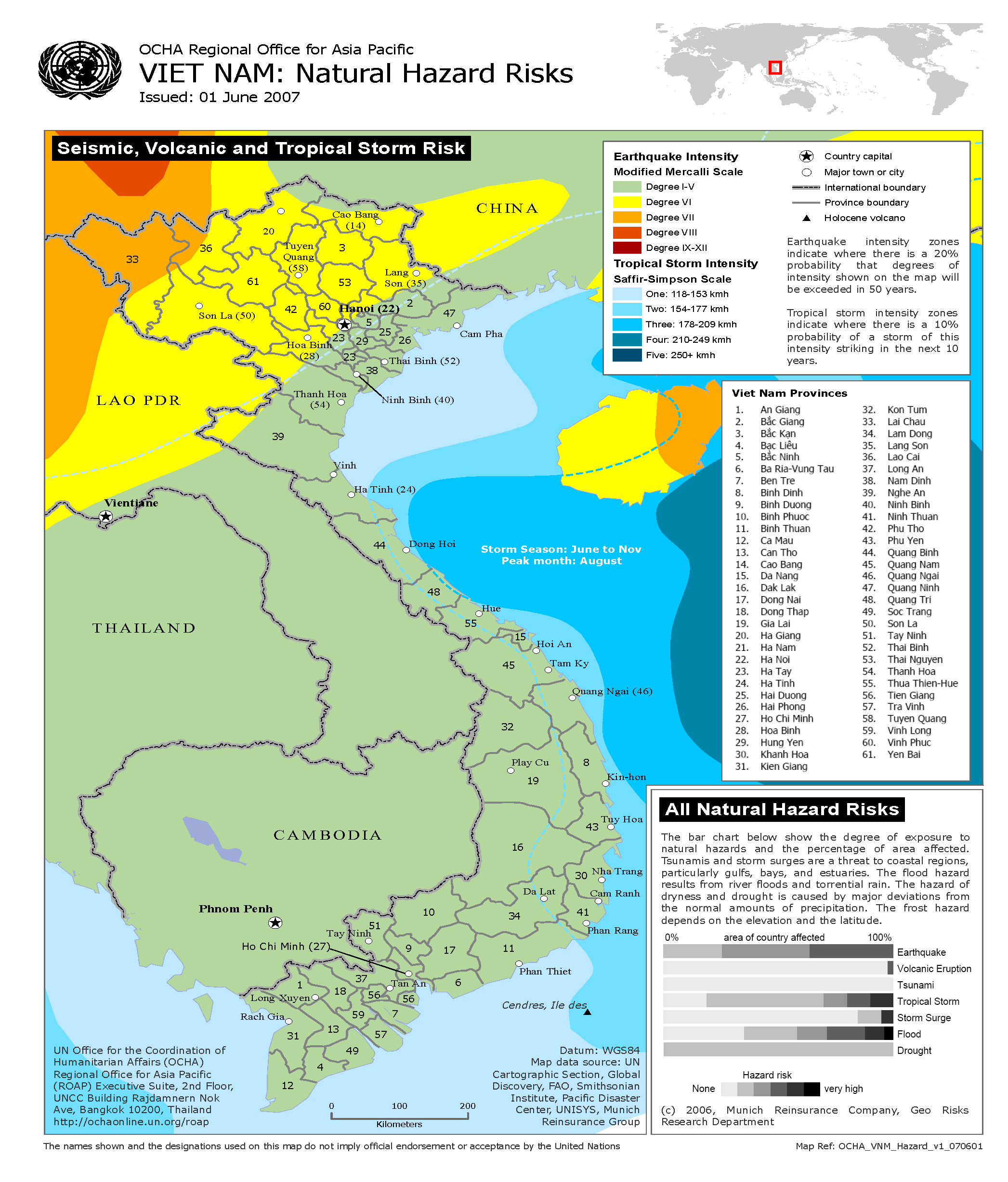 Bản đồ dưới đây cho thấy 3 tỉnh Bắc Trung Bộ: Quảng Bình, Quảng Trị và Thừa Thiên – Huế là rốn bão của Việt Nam. Điều không may đây cũng là khu vực có địa hình dốc, bề nganh hẹp (hẹp nhất tại Quảng Bình chỉ có 50km) và chặn phía Tây bởi dãy Trường Sơn. Mưa tại thượng nguồn sẽ đổ về đồng bằng với lưu lượng lớn và tốc độ nhanh như đã xảy ra ở Huế hồi năm 1999 khi nước dâng 0,5 m/giờ làm chết 400 người và thiệt hại 1/3 GDP của tỉnh.