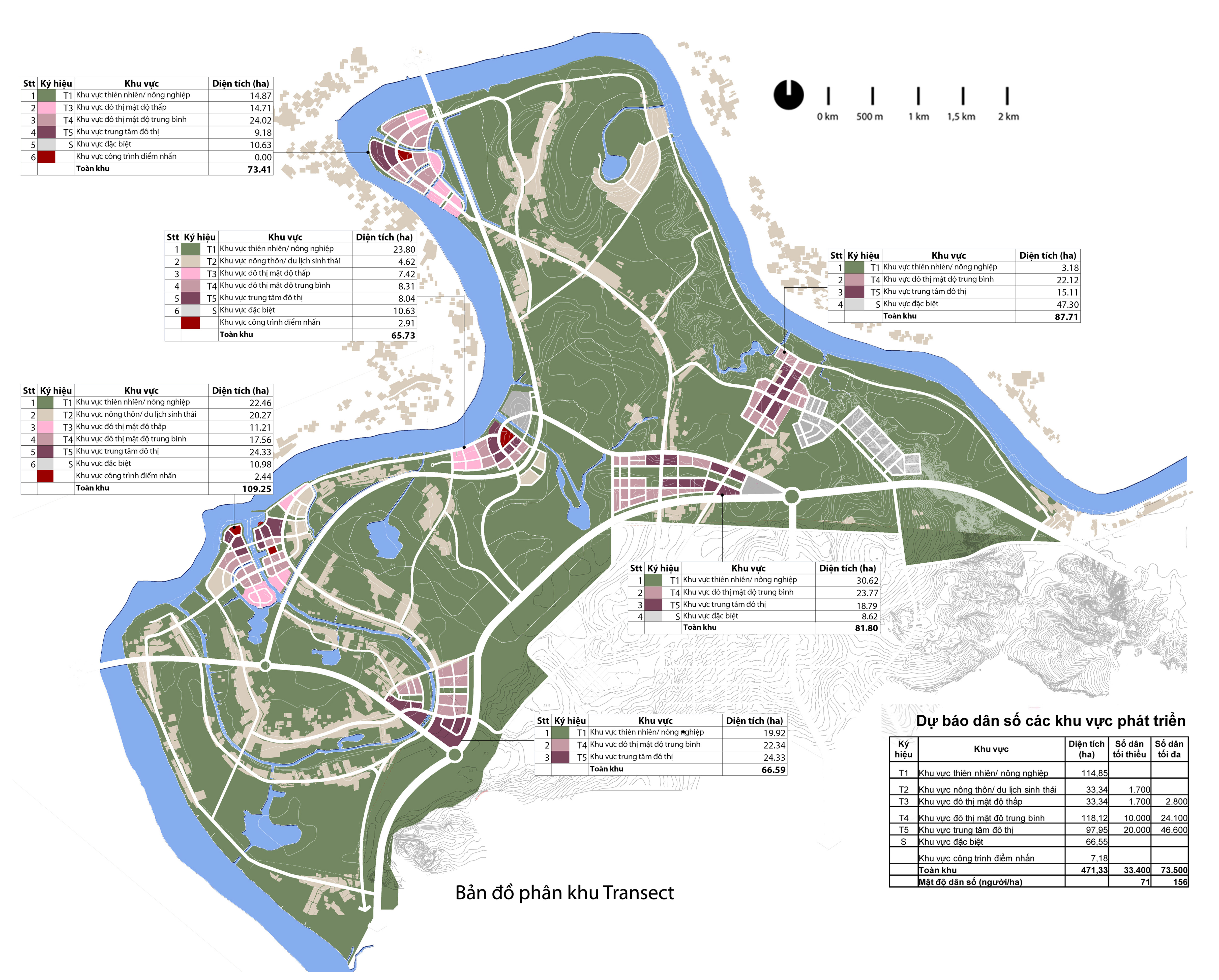 Đồ án đáp ứng được dân số khoảng 15 vạn người. Thực ra nếu xem kỹ bảng quy định chỉ tiêu quy hoạch cho từng loại transect zone, bạn sẽ thấy là mật độ có thể linh động thay đổi. Mục tiêu đồ án không phải là đưa ra một hình ảnh cố định và một chỉ tiêu cứng về quy hoạch. Thiết kế các khu chỉ là mình hoạ và thỏa mãn yêu cầu của cuộc thi. Quan trọng nhất là đồ án đưa ra một khung phát triển dựa trên nguyên tắc bảo tồn đất đai nông nghiệp, giảm thiểu rủi ro thiên tai và phát triển bền vững.