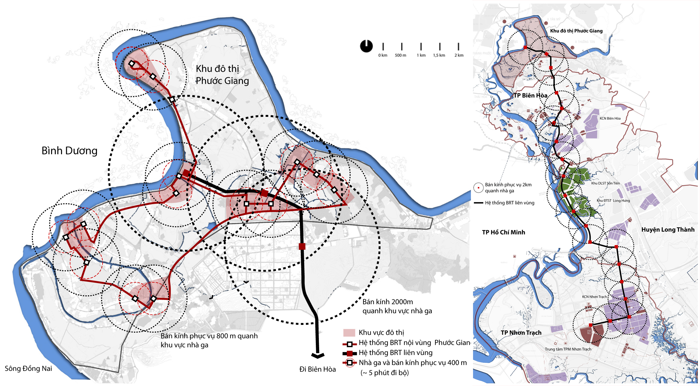 4. Tập trung phát triển phía Tây Phước Giang dọc theo tả ngạn sông Đồng Nai để: 1) khai thác nhu cầu phát triển và các hoạt động kinh tế mạnh mẽ phía Bình Dương; 2) khai thác khả năng kết nối giao thông với thành phố mới Bình Dương và thành phố Hồ Chí Minh (cả đường bộ và đường sông); 3) bảo tồn cảnh quan nông nghiệp phần phía Đông Phước Giang và bảo vệ nguồn nước thượng nguồn sông Đồng Nai; 4) tránh xa các khu công nghiệp vốn nằm ở đầu gió Đông Nam phía Nam và Đông Phước Giang; 5) chiếm lĩnh khu vực có nguy cơ phát triển các hoạt động du lịch tự phát do vị trí thuận lợi.