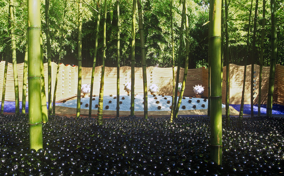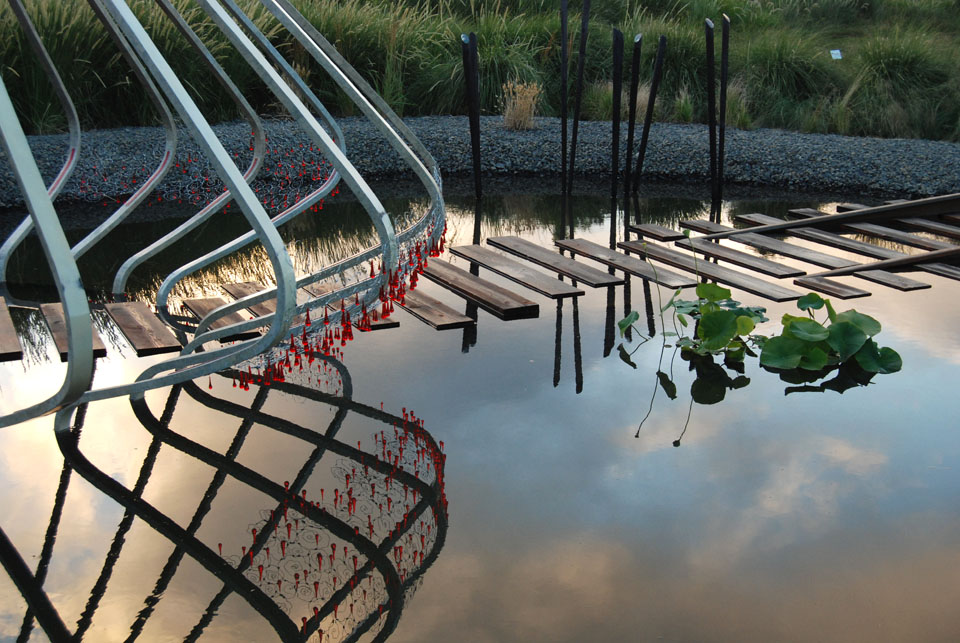 Hình 5: Vườn Ru (Lullaby Garden) được thực hiện trong khuôn khổ Lễ hội Vườn “Những hòn đá tảng” cùng với 11 tác phẩm khác của những nhà thiết kế hàng đầu thế giới. 60 nghệ nhân ở một làng ngoại thành Sài Gòn đã tham gia đan 200 tấm chiếu để trải lên một mảnh vườn rộng gần 200 m2. Dây cước được chăng làm hàng rào khi ẩn khi hiện trong ánh nắng. Lời hát ru của ca sĩ Hương Thanh được phát trong vườn tạo âm hưởng của làng quê Việt Nam.