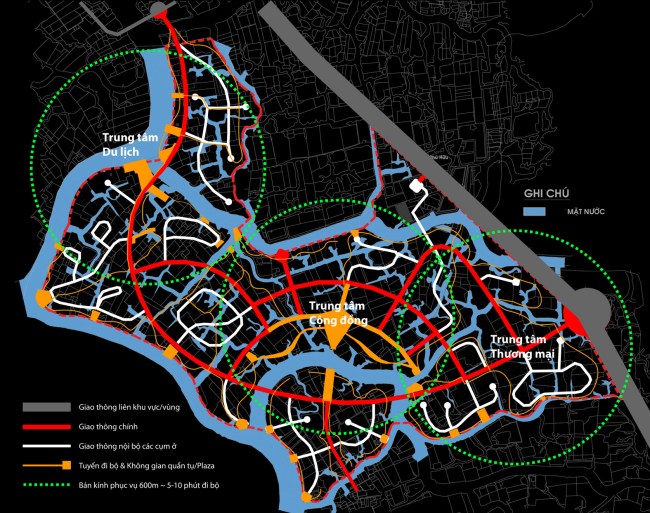 Từ trục chính, các trục giao thông thứ cấp được phát triển. Tại các giao điểm giao thông quan trọng, các điểm nhìn đẹp, xác định các không gian công cộng/quảng trường quan trọng (plaza). Các mảng xanh (chiếm 30% diện tích đất) được xác định dựa theo hai căn cứ chính: