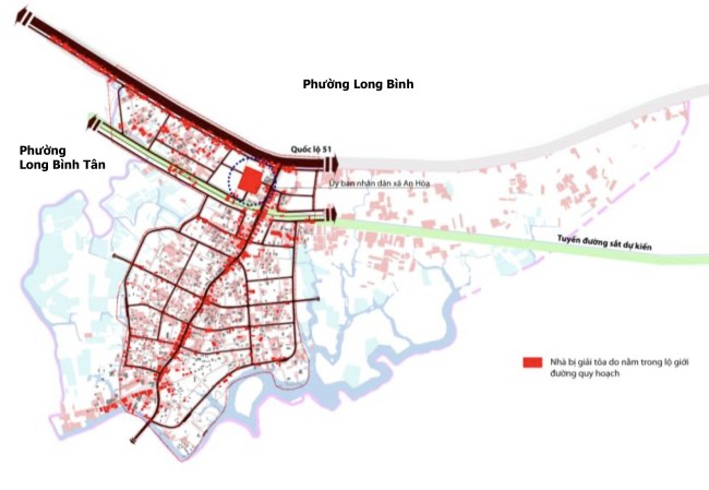 Trong khi chưa có giải pháp để trả lời những câu hỏi trên, quy hoạch đã phê duyệt của phường Long Bình Tân giáp ranh bố trí một trạm xử lý nước thải lớn cho toàn thành phố nhưng nằm ngoài phạm vi nghiên cứu của đồ án và nằm trong … diện tích xã An Hòa, sát với khu trung tâm xã (hình 11). Một ví dụ của cách làm quy hoạch áp đặt và cẩu thả, trạm xử lý nước thải này sẽ gây khó khăn cho việc điều chỉnh quy hoạch và ảnh hưởng trực tiếp đến đời sống của người dân khu trung tâm xã An Hoà trong tương lai.