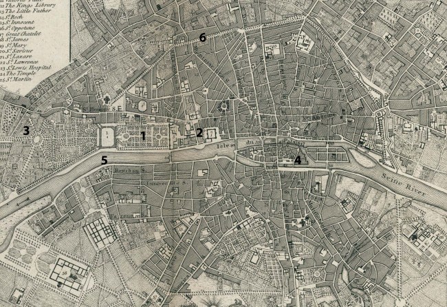 Hình 1.: Bản đồ Paris năm 1800 thể hiện tình trạng của thành phố trước QHCT Paris của Haussmann. Chú thích: 1-Vườn Tuileries, 2-Cung điện Louvre, 3-Champs Elysées, 4-Nhà thờ Đức Bà, 5-Sông Seine và 6-Boulevard. Nguồn: http://commons.wikimedia.org/wiki/Category:Old_maps_of_Paris