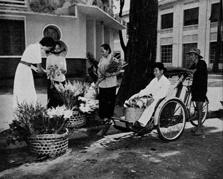 Giờ cao điểm trên đường Pasteur và gánh hàng hoa gần nhà thờ lớn. Ảnh trong cuốn: Saigon: A Booklet of Helpful Information for American in Vietnam (Cuốn sổ tay với thông tin hữu ích cho người Mỹ ở Việt Nam) năm 1959. Nguồn: Thư viện Đại học Cornell.