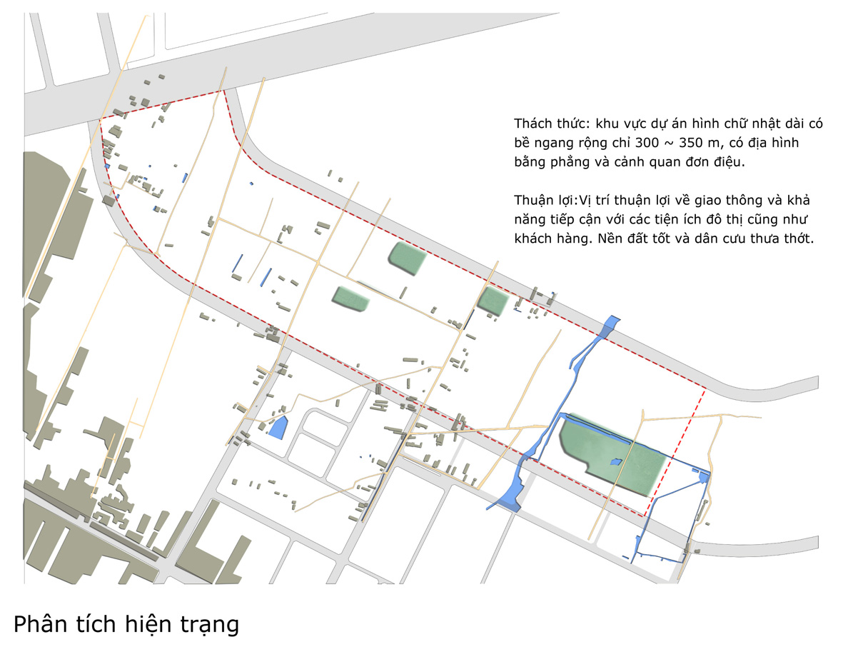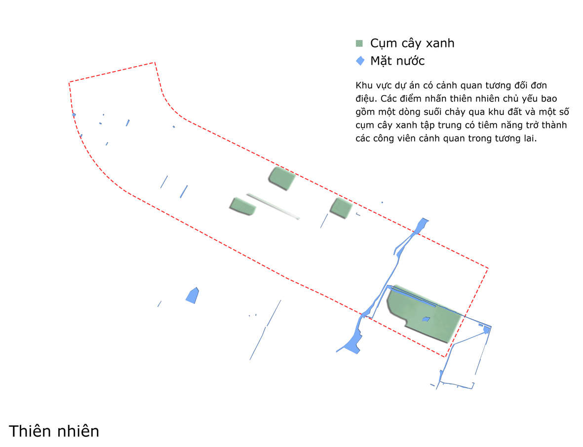 This 51-hectare site has few distinguishing existing features with the exception of a small creek running through the eastern portion of the site. The development has been organized to contrast high-density development next to the Saigon-Nhon Trach Highway and changing pattern to a more suburban development to the east creating two distinct environmental experiences.