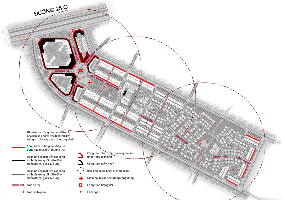 – Thứ 2 là trục giao thông chính của đồ án này ngoài hướng từ Tây Bắc xuống Đông Nam còn có hướng ngược lại từ Đông Nam (phía tĩnh với khu vực biệt thự) lên Tây Bắc (Thương mại). Tuyến ngược lại này đối xứng với tuyến cũ qua trục nối giữa nhà 2 với trường tiểu học. 2 đoạn còn lại ở 2 đầu là chung.