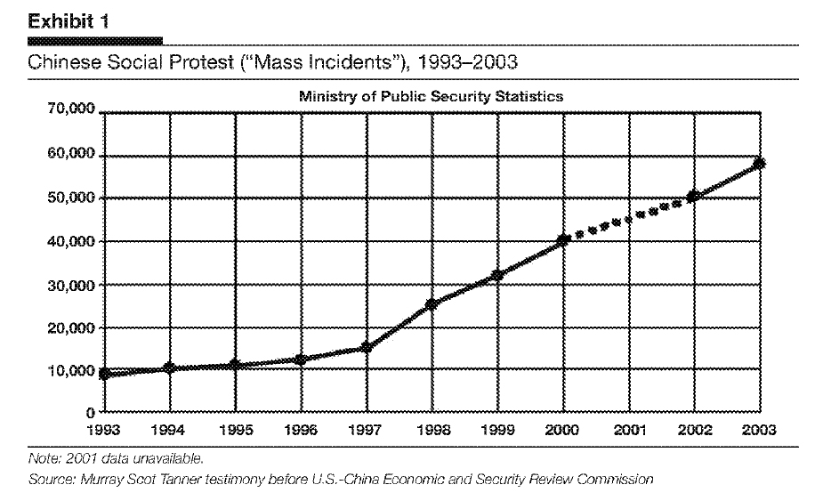Các cuộc biểu tình phản đối chính quyền địa phương ở Trung Quốc cũng gia tăng và thông tin của những sự kiện như thế không tiếp cận được. Các “tụ tập đông người” này có thể dao động trong khoảng số lượng từ tám đến hàng trăm người dân và có thể diễn ra trong hòa bình hay bạo lực. Dù không thể có được con số chính thức các cuộc biểu tình liên quan đến lấy đất, theo nhiều nguồn tin, phần lớn trong số đó xuất phát từ việc kiểm soát đất. Ngoài ra, sự gia tăng không chỉ nằm ở số lượng các cuộc biểu tình mà còn là mức độ bạo lực. Trong khi đó, những người biểu tình đã cho thấy trình độ nâng cao của mình, thậm chí nông dân sử dụng điện thoại di động và máy quay phim để nhanh chóng liên kết đến các phương tiện truyền thông bên ngoài, thu hút sự chú ý trên toàn thế giới về nguyên nhân vụ việc. Mặc dù hầu hết các cuộc biểu tình không có bạo lực, số cuộc biểu tình rõ ràng tăng lên và chính quyền địa phương phải đối mặt với sự chống đối cũng như chỉ trích ngày càng nhiều.