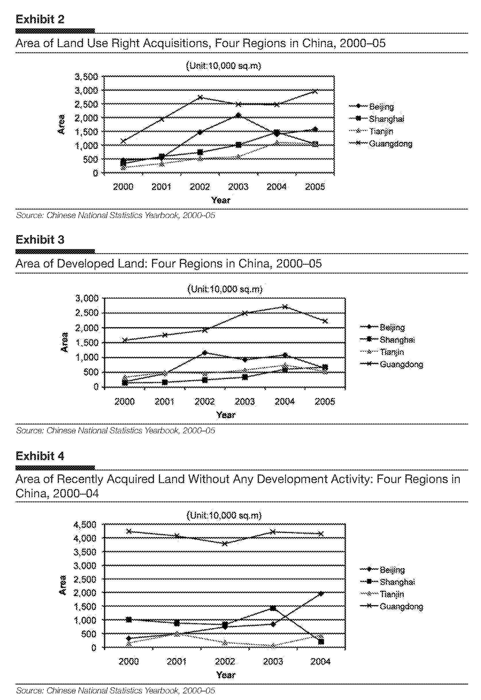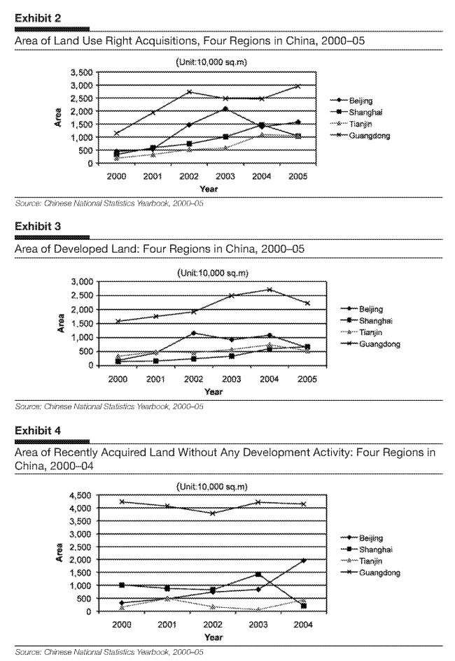 Vào lúc bắt đầu quá trình chuyển đổi, Trung Quốc và Việt Nam nằm trong số những quốc gia nghèo nhất thế giới. Điều này khiến việc chính phủ lấy đất một cách hợp pháp dễ dàng hơn. Như tại hầu hết các nước đang chuyển đổi, chương trình nghị sự quốc gia bao quát của họ là phát triển kinh tế, lấn át hầu như bất kỳ vấn đề công hoặc quyền nào khác (Grindle and Thomas 1991). Sứ mạng này đã là động lực cho việc lấy đất quy mô lớn. Việc lấy đất còn được ‘hỗ trợ’ bởi việc thiếu các giới hạn về diện tích đất lấy cho các dự án được đề xuất, với nhiều khoản nợ quá hạn, ít giải trình cho tính khả thi về mặt tài chính của dự án, cả khu vực công lẫn tư nhân. Có nhiều ví dụ về việc xây dựng tràn lan và chỗ trống tồn tại trong những khu chế biến xuất nhập khẩu, thị trấn mới, và các liên doanh khác mà hàng trăm chính quyền địa phương đã xây dựng. Hình 2 cho thấy việc lấy đất tràn lan của chính quyền Trung Quốc. Những số liệu được lấy từ Niên giám thống kê của chính quyền trung ương. Biểu đồ thứ nhất thể hiện diện tích đất bị lấy nói chung đã tăng trong những năm qua. Biểu đồ thứ hai cho thấy những diện tích này đã được phát triển hoặc chưa phát triển ra sao, minh họa một xu hướng giảm bắt đầu từ năm 2002, ngoại trừ ở tỉnh Quảng Ðông, vốn đã bắt đầu chậm đi từ năm 2004. Biểu đồ thứ ba cho thấy diện tích đất bị lấy còn chưa được sử dụng.