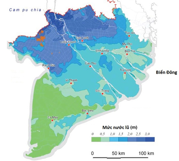 Hình 3. Mực nước lũ tại vùng Đồng bằng sông Cửu Long khi nước biển dâng cao 30cm (màu thay đổi từ xanh lá cây sang xanh dương đậm thể hiện mức nước lũ tương ứng từ 0m đến 3m. Nguồn: Ngân hàng thế giới 2010;