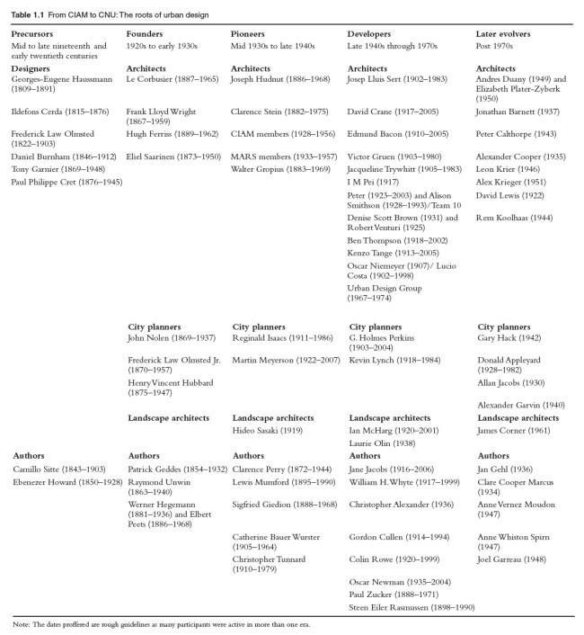 Bảng 1: Từ CIAM đến CNU – Cội nguồn của thiết kế đô thị. Chú giải: Precursors – Tiền bối; Founders – Nhóm Sáng Lập; Pioneers – Nhóm Tiên Phong; Developers – Nhóm Phát Huy; Late evolvers – Nhóm Ăn Theo; Designers – Các nhà thiết kế; Architects – Các kiến trúc sư; City planners – Các quy hoạch sư; Landscape architects – Các kiến trúc sư cảnh quan; Authors – Các tác giả;