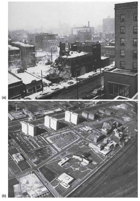 Đầu thập kỷ 60, Martin Meyerson và Jacqueline Tyrwhitt của Harvard xuất bản một cuốn sách kinh điển, tổng kết những công trình tiêu biểu về thiết kế đô thị ở Mỹ và châu Âu, cả Mỹ La tinh, thể hiện những nguyên tắc cơ bản của ngành thiết kế công nghiệp thời kỳ Hậu chiến. Đáng chú ý là trong cuốn sách này không có dự án Stuyvesant Town (1947), một dự án lớn với 18 block nhà, 11.500 căn ở hạ Manhattan. Sự bỏ sót này báo hiệu trước một rạn nứt trong lý thuyết thiết kế đô thị sẽ ngày một toác rộng trong những năm 60,70. Những tiếng nói phản biện xuất phát từ lĩnh vực xã hội học, rồi lan sang cả lĩnh vực kỹ thuật, thiết kế không gian, với những tên tuổi như Jane Jacobs (1961), Kevin Lynch (1960), Gordon Cullen (1961), Christopher Tunnard và Boris Pushkarev (1963), Robert Venturi, Denise Scott Brown và Steven Izenour (1972), Colin Rowe và Fred Koetter (1978), và William H. Whyte (1980).