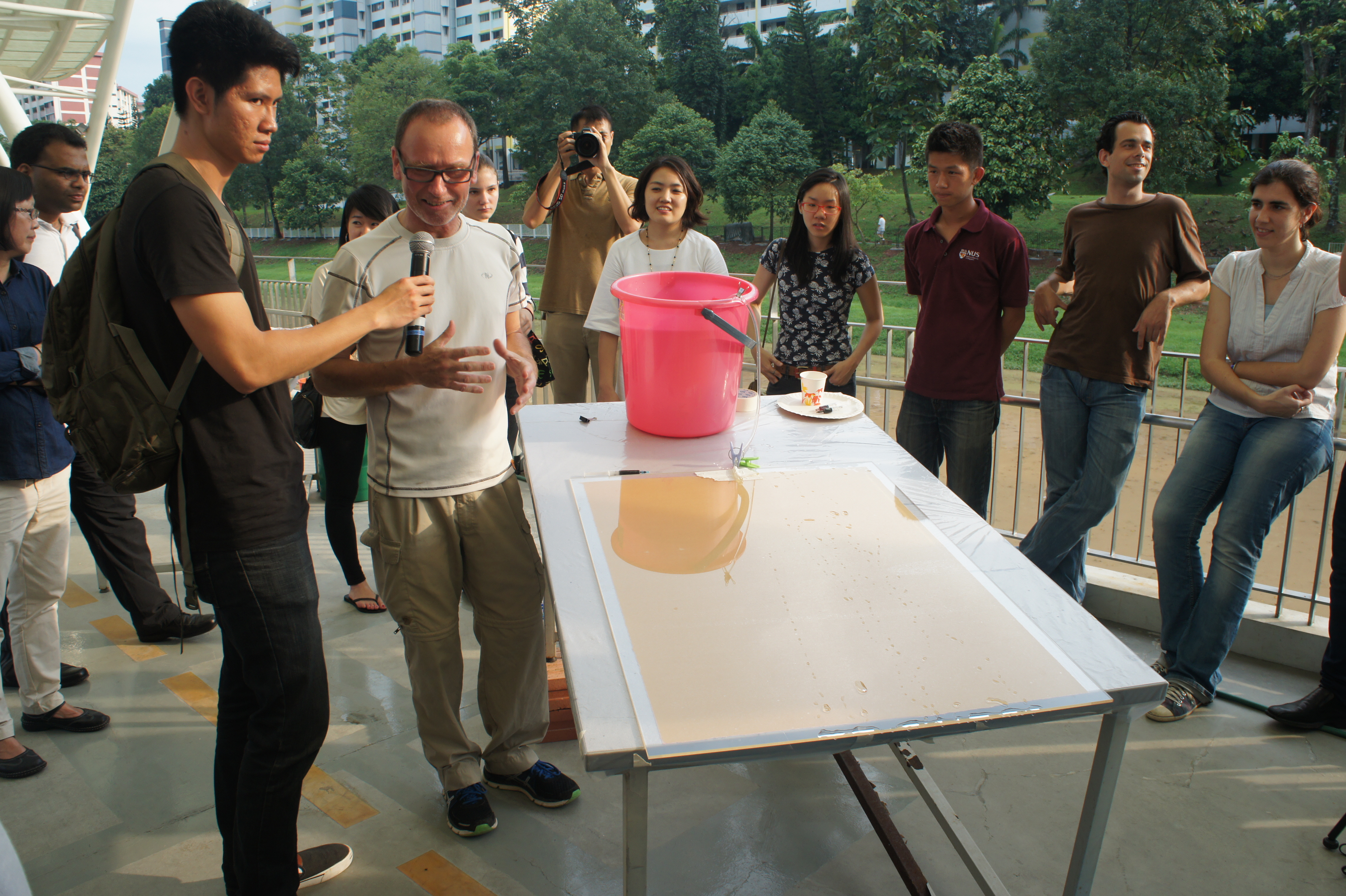 Để kỷ niệm ngày Nước Thế Giới (World Water Day) năm nay, công ty Atelier Dreiseitl, công ty chuyên về thiết kế cảnh quan và đô thị nhạy cảm với nước nổi tiếng thế giới, và trường Đại học Quốc gia Singapore tổ chức một workshop đặc biệt tại trung tâm nghiên cứu môi trường nước Van Kleef nằm bên dòng kênh Panda. Nghệ sĩ, kiến trúc sư Herbert Dreiseitl, người đã nói chuyện với giới kiến trúc sư Hà Nội vào cuối tháng 1 năm nay về vai trò của nước trong đời sống và thiết kế, nêu lên ý tưởng và thực hiện những thí nghiệm nhỏ nhưng vô cùng thú vị để mọi người có thể hiểu và trân trọng sự kỳ diệu của nước thay vì chỉ nói về những vấn đề nhức nhối trong một ngày có ý nghĩa như thế này.