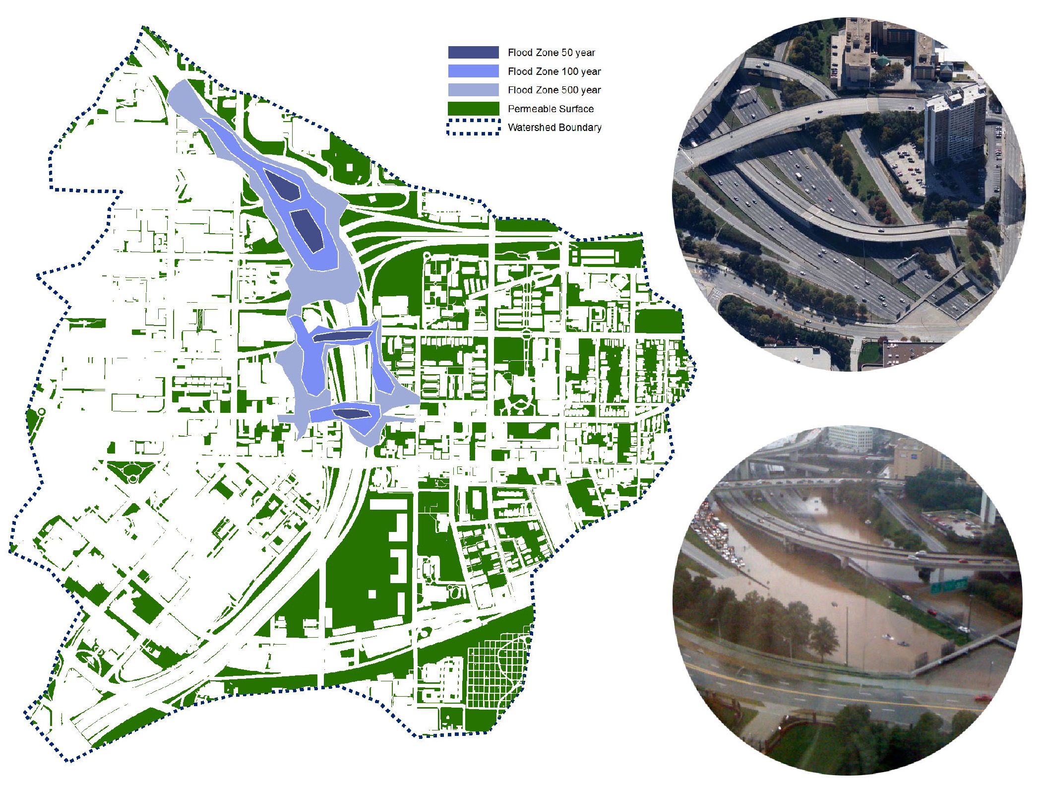 Trước khi “chạy” mô hình, một yếu tố cần xem xét là tuyến đường cao tốc liên bang I-85/75 rộng 10 làn xe chạy qua lưu vực trung tâm và chia cắt khu vực này thành 2 phần rất khác biệt: trung tâm thương mại và văn phòng ở phía Tây [CBD] và một khu dân cư cũ ở phía Đông. I-85/75 có đoạn đi chìm theo một vũng trũng của địa hình nhưng cũng có đoạn ở trên cao. Do đó để xử lý tác động của tuyến cao tốc này vào hệ thống thoát nước, đồng thời cũng để minh họa sự khác biệt về thủy văn giữa hai khu vực Đông và Tây vốn rất khác nhau về tỷ lệ bê-tông hóa, lưu vực trung tâm được chia làm 3 phần: phần phía Đông, phần Trung tâm [phần diện tích chiếm chỗ của đường cao tốc] và phần phía Tây.