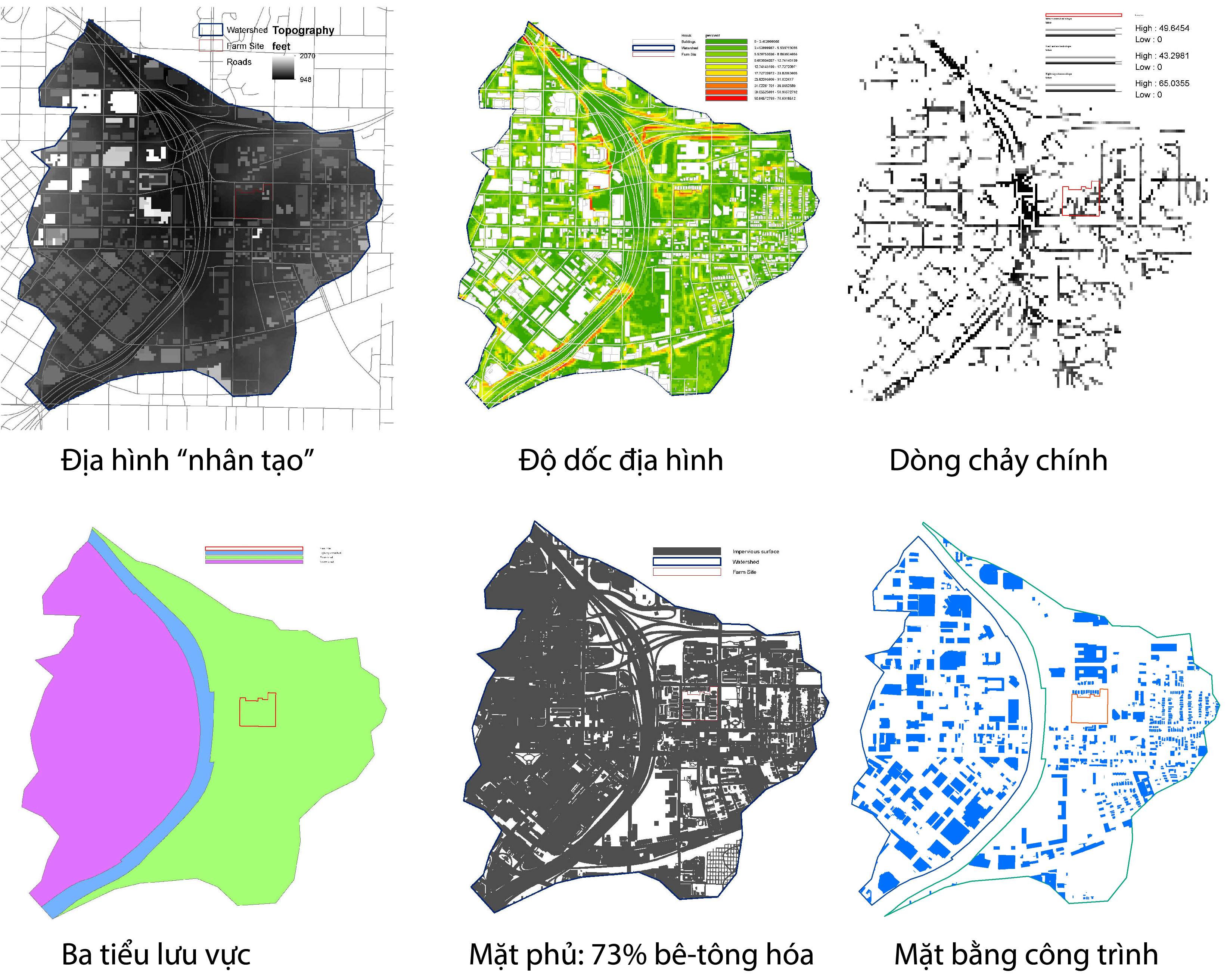 Chúng tôi xây dựng địa hình “nhân tạo” bằng cách “đặt” các tòa nhà, vốn đã có thông tin về khối và tầng cao [data dạng shapefile], lên trên địa hình tự nhiên [data dạng TIN]. Kết quả “hôn phối” này được chuyển thành định dạng DEM [mô hình địa hình điện tử – data dạng raster hay điểm ảnh] để thực hiện các phân tích trong một công cụ phân tích thủy văn của ArcGIS được gọi là ArcHydro. Do vấn đề an ninh, các thông tin điện tử về hệ thống cấp và thoát nước tại Mỹ không được cung cấp ra bên ngoài. Do đó, để mô phỏng tác động của hệ thống thoát nước, vốn thường nằm dưới lòng đường, tất cả lòng đường được hạ thấp xuống thêm 1 foot, tức là khoảng, để khiến cho nước chảy bề mặt sẽ dồn về phía đường như trong thực tế khi chạy mô hình.