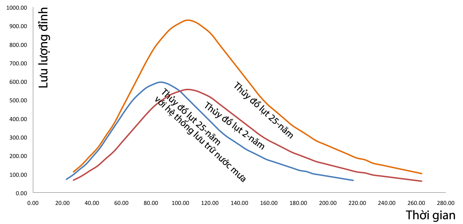 Hình 4: Thủy đồ toàn lưu vực trong 3 viễn cảnh: lụt 2-năm, lụt 25-năm và lụt 25-năm trong điều kiện có hệ thống lưu trữ nước mưa tại chỗ như đề xuất thiết kế.