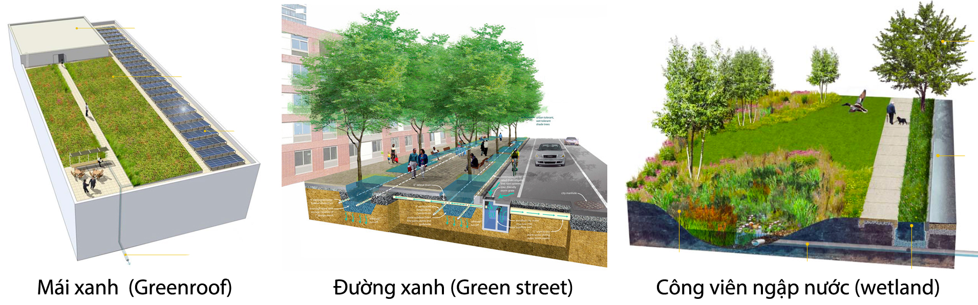 Hình 5: Ba công cụ trong thiết kế đô thị nhằm lưu trữ nước mưa và làm giảm tốc độ và lưu lượng dòng chảy bề mặt. Nguồn: đồ họa của WRT và Sasaki.