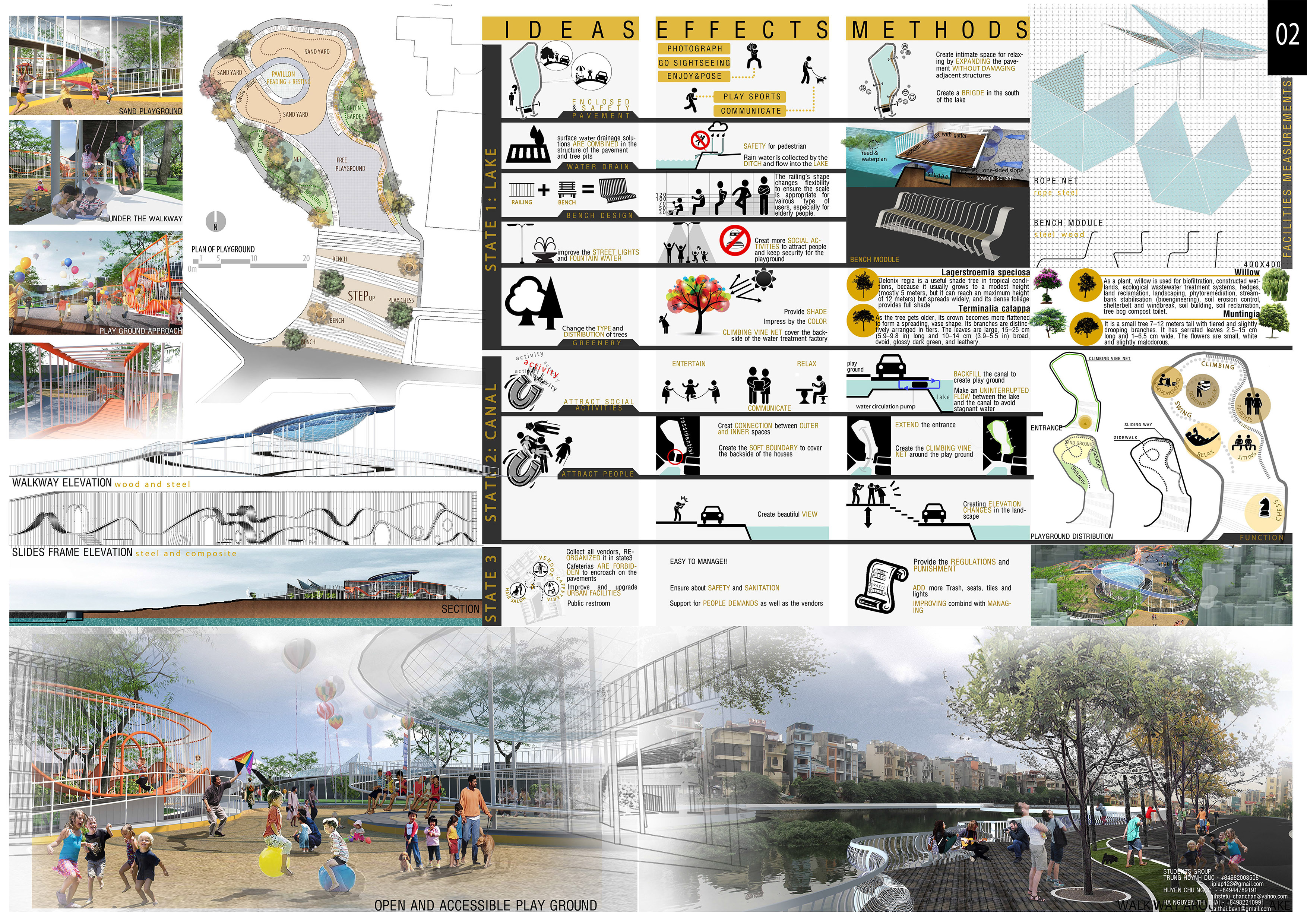Khu vực thứ 2 mà phương án quan tâm là khu vực sân chơi, được cải taọ từ mương nước cũ nằm sát theo hướng Bắc so với hồ Kim Liên. Đây là khu vực đã bỏ hoang từ lâu và chưa có chiến lược cải tạo. Trong thời gian nghiên cứu, chúng tôi đã nhận thấy vị trí này có một tiềm năng lớn trong việc liên kết khu vực và đề xuất phát triển cải tạo không gian này thành một sân chơi chủ yếu dành cho trẻ em. Các thiết bị, đồ chơi ngoài trời hiện nay đã trở nên lỗi thời và thiếu tính tương tác, các không gian sân giữa rời rạc, bị cô lập. Do đó, ý tưởng cải tạo khu vui chơi này là nơi mà tất cả trẻ em trong khu vực đều được vui chơi, giao tiếp với nhau, đây cũng là một đinh hướng giáo dục tốt cho trẻ em, tiếp xúc dần dần với xã hội. Để thay thế các đồ chơi ngoài trời cũ, chúng tôi đã tham khảo một số không gian dành cho trẻ em và đề xuất một mô hình chơi liên hoàn dựng nên từ một hệ khung thép với hình dáng mềm mại, biến đổi liên tục, tạo sự hấp dẫn về thị giác và màu sắc nổi bật cho trẻ nhỏ. Xen kẽ tổ hợp liên hoàn này là các không gian chơi cho trẻ với bố mẹ, các không gian ngồi trông trẻ cho bố mẹ, đường dạo và võng nghỉ … Tuy không gian này bố trí nhiều hoạt động khác nhau nhưng không hề bị đóng kín, ngược lại hoàn toàn mở mà vẫn đảm bảo không bị lẫn lộn về chức năng sử dụng. Khu mương nằm lọt giữa các dãy nhà có chiều cao trung bình là 4-5 tầng, không gian tốivà mất mỹ quan. Để cải thiện tình trạng nước tù ô nhiễm của khu vực, chúng tôi đã đề xuất sử dụng hệ thống báy bơm nước tuần hoàn với khu vực hồ nhằm tận dụng nhà máy lọc nước sẵn có khu vực phía nam hồ. Bề mặt sân chơi được nâng lên một cốt cao hơn so với mặt đường là 1,5-2m tạo sự kết nối và hướng nhìn cảnh quan ra hồ cũng như làm tăng chiếu sáng tự nhiên cho sân chơi.
