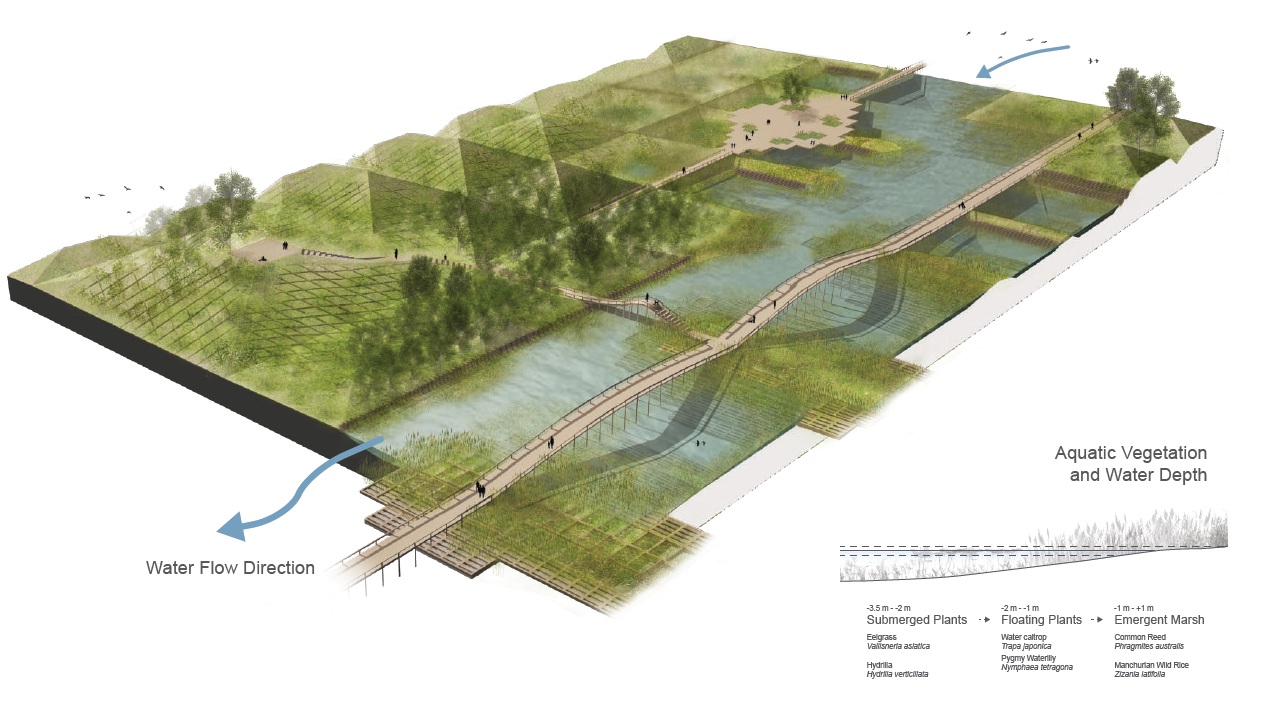 Tác giả đề xuất trồng eelgrass, hydrilla cho các loài thủy sinh; pigmy waterlily, water caltrop cho các loài trên mặt nước; common reed, manchurian wild rice cho cây bụi có rễ ngập nước.