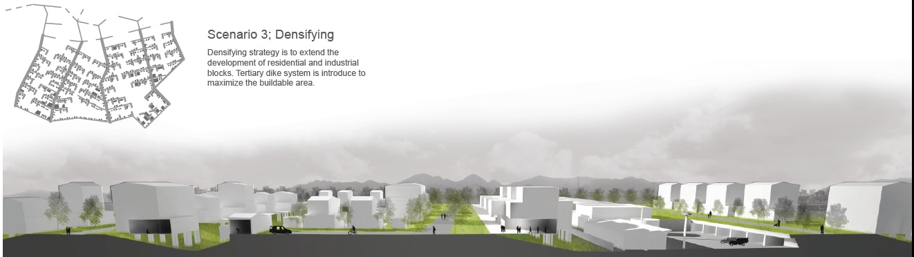 Chiến lược nâng cao mật độ được dùng đế tập trung phát triển các khu vực dân cư và sản xuất công nghiệp. Hệ thống đê thứ cấp được dùng để gia tăng tính an toàn cho các công trình.