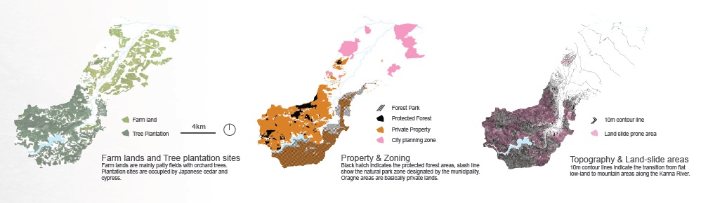 Các bản đồ thể hiện hiện trạng khu vực. Bản đồ bên phải thể hiện các đường đồng mức 10m, cho thấy địa hình đồi dốc tại khu vực đập Shimokubo. Màu hồng là khu vực có nguy cơ sạt lở đất.