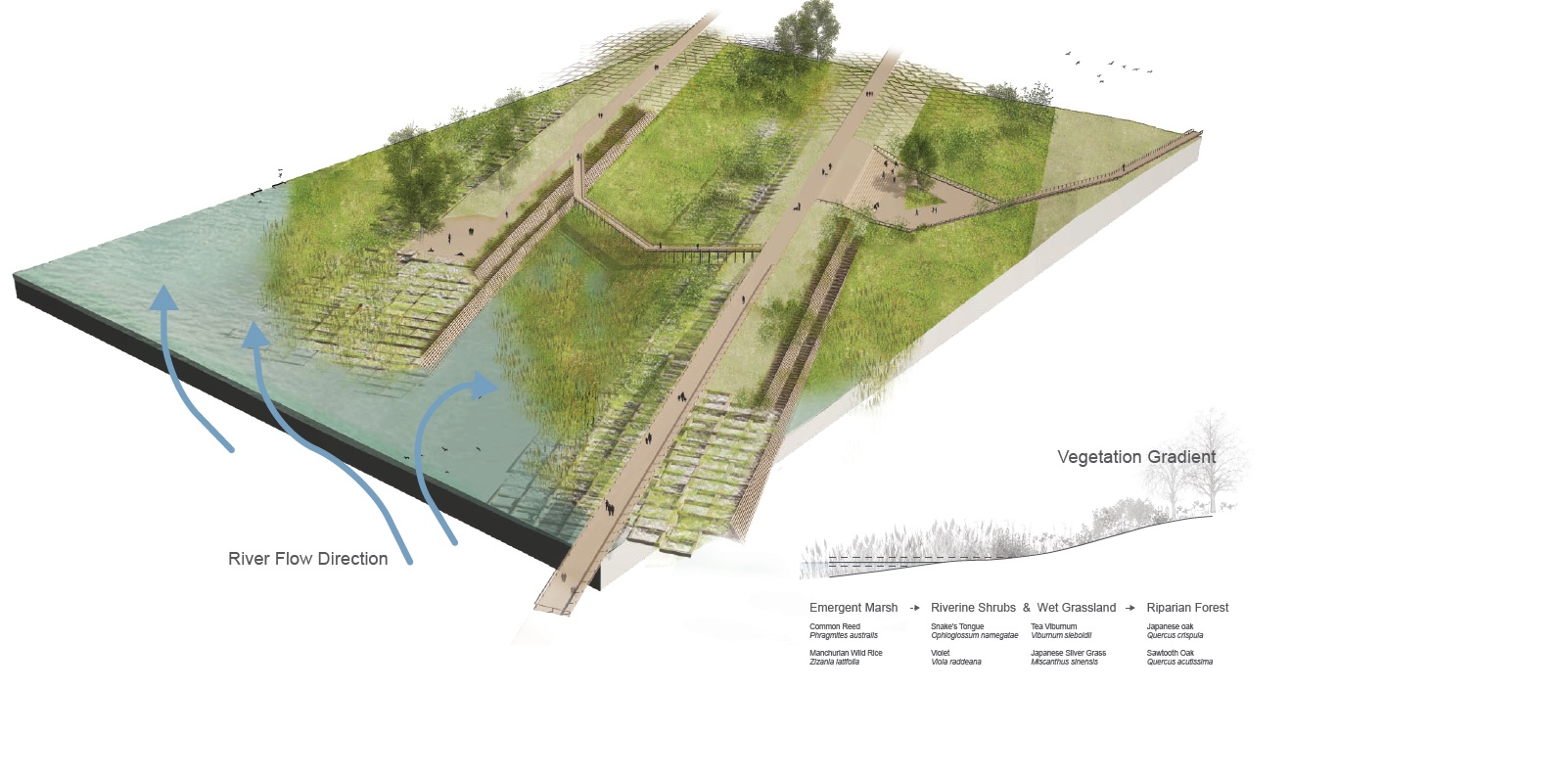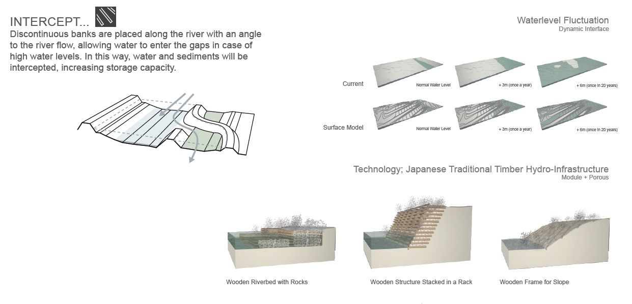 Mô phỏng thay đổi của mặt nước trong điều kiện thông thường, khi dâng cao 3m và 6m. Thiết kế mới của bờ sông vẫn giữ không gian cho nước đồng thời tạo được không gian sinh hoạt đô thị. Các vật liệu gỗ và đá được thiết kế làm các mô đun theo nhiều hình dạng khác nhau.