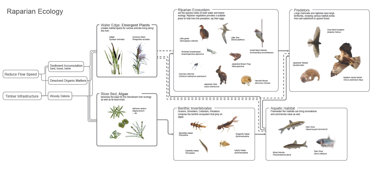 Do thiếu sự chăm sóc và mật độ rừng trồng quá cao nên khu vực này thường xảy ra xói lở và có tính đa dạng sinh thái thấp. Tác giả đề xuất hạ bớt mật độ rừng trồng bằng cách đốn bỏ có kế hoạch để tạo không gian cho các loài khác phát triển. Hệ sinh thái đa dạng, đa tầng sẽ giúp hạn chế xói lở khi mưa lớn xảy ra, theo đó lượng bùn bồi lắp trong đập cũng giảm đi. Bùn đất và gỗ sau khi cải tạo đập sẽ được vận chuyển theo đường sông đến khu vực sông Tone. Bùn đất và gỗ được xử lý để làm các kết cấu dọc bờ sông, tạo không gian phát triển hệ sinh thái.