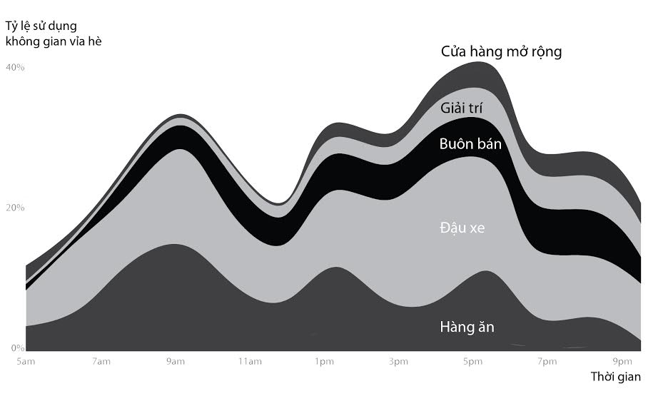 Trên những vỉa hè TP.HCM, nhiều người cùng chia sẻ không gian cho những hoạt động khác nhau, vào những thời điểm khác nhau. Ở một góc phố, lúc 5g sáng, vỉa hè là nơi ngả lưng của những người muốn hưởng sự thoáng đãng của khí trời. Sau đó là nơi phục vụ bữa sáng và cà phê. Có một khoảng lặng trước khi vỉa hè lại đông đúc trong giờ ăn trưa. Vào lúc xế chiều, vỉa hè là nơi mọi người ngồi nghỉ, ngắm phố phường hoặc mua bán. Tất cả những câu chuyện này diễn ra trên một đoạn vỉa hè. Thật kỳ diệu khi ta nhận ra rằng bao nhiêu phần của cuộc sống có thể được nuôi dưỡng trong không gian công cộng khiêm nhường này.