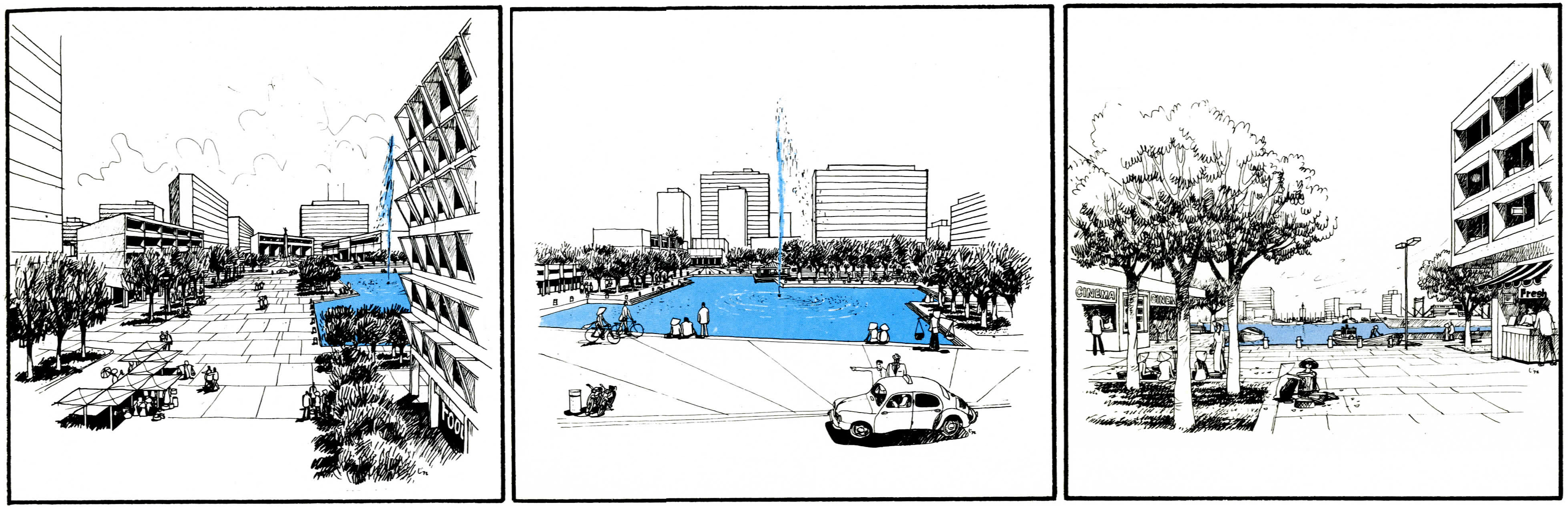 Phối cảnh của đồ án quy hoạch phát triển Thủ Thiêm năm 1972 (từ trái qua phải): Trung-tâm Chánh-Quyền, Trung-tâm Văn-hóa Giáo-dục và Khu Chợ búa. Nguồn: Wurster, Bernadi and Emmons Architects and Planners (1972).