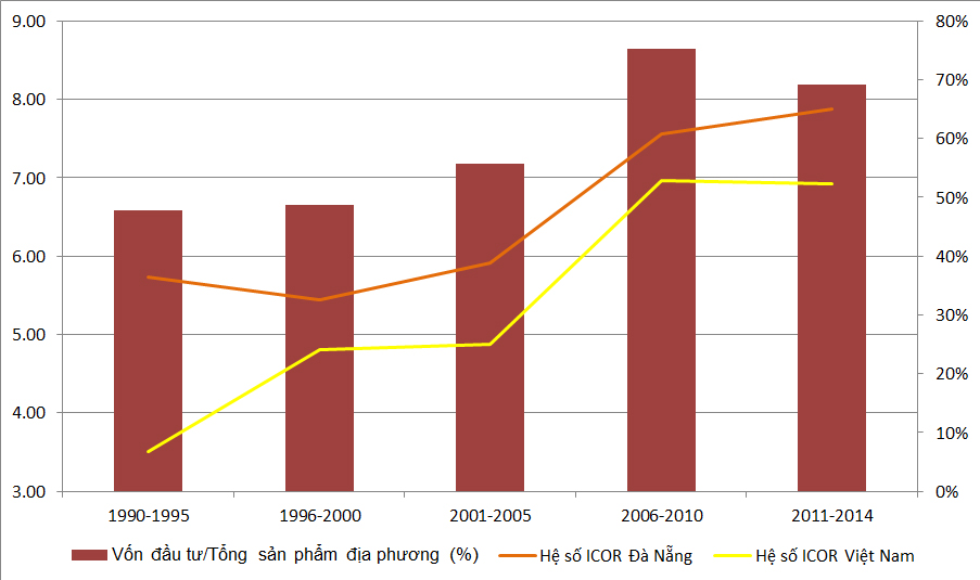 Đầu tư nhiều, hiệu quả thấp. Chỉ số ICOR của Đà Nẵng lên tới 7.9 là rất đáng lo. Chỉ số ICOR của Đà Nẵng luôn cao hơn Việt Nam vốn đã được coi là cao nhất trong khu vực châu Á. Nguồn số liệu: Ngân hàng thế giới, Tổng cục thống kế & Cục thống kê Đà Nẵng.